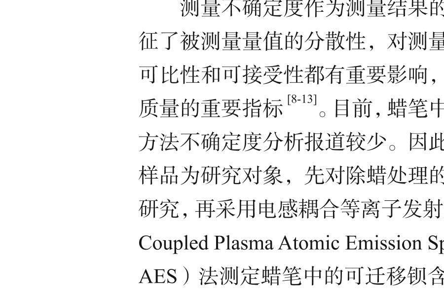 测量不确定度作为测量结果的一部分,合理表征了被测量量值的分散性,对测量结果的可信性、可比性和可接受性都有重要影响,是评价测量活动质量的重要指标[8-13]。目前,蜡笔中可迁移钡的测定方法不确定度分析报道较少。因此,本研究以蜡笔样品为研究对象,先对除蜡处理的实验条件进行了研究,再采用电感耦合等离子发射光谱(Inductively Coupled Plasma Atomic Emission Spectrometer,ICP-AES)法测定蜡笔中的可迁移钡含量,建立可迁移元素不确定度分析的数学模型,并对影响其不确定度的分量进行分析,旨在为评定测量结果质量和方法的可靠性提供科学依据。